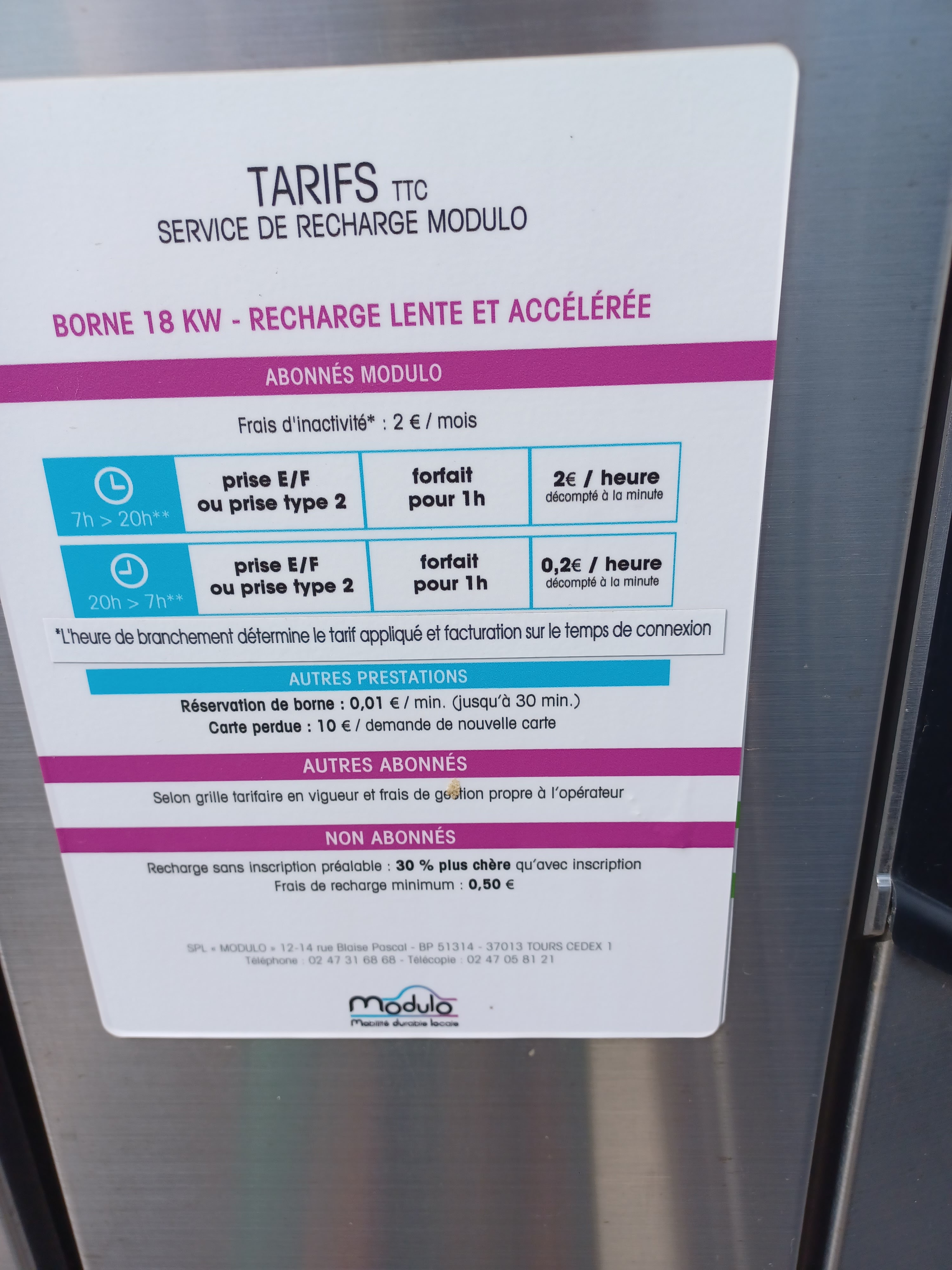 Fonctionnement facile, mais la facturation est une arnaque car on est facturé alors que la batterie est rechargée. J'ai mis la voiturer à charger le soir vers 21H30 pour bénéficier du tarif de nuit (10 fois moins chère 0,20 centimes). J'ai eu l'alerte de fin de charge à 1H00 et quand je suis revenu la chercher le matin, le temps facturer correspond à la période de départ jusqu'à la récupération. J'ai joint les tarifs affichés lors de mon passage.