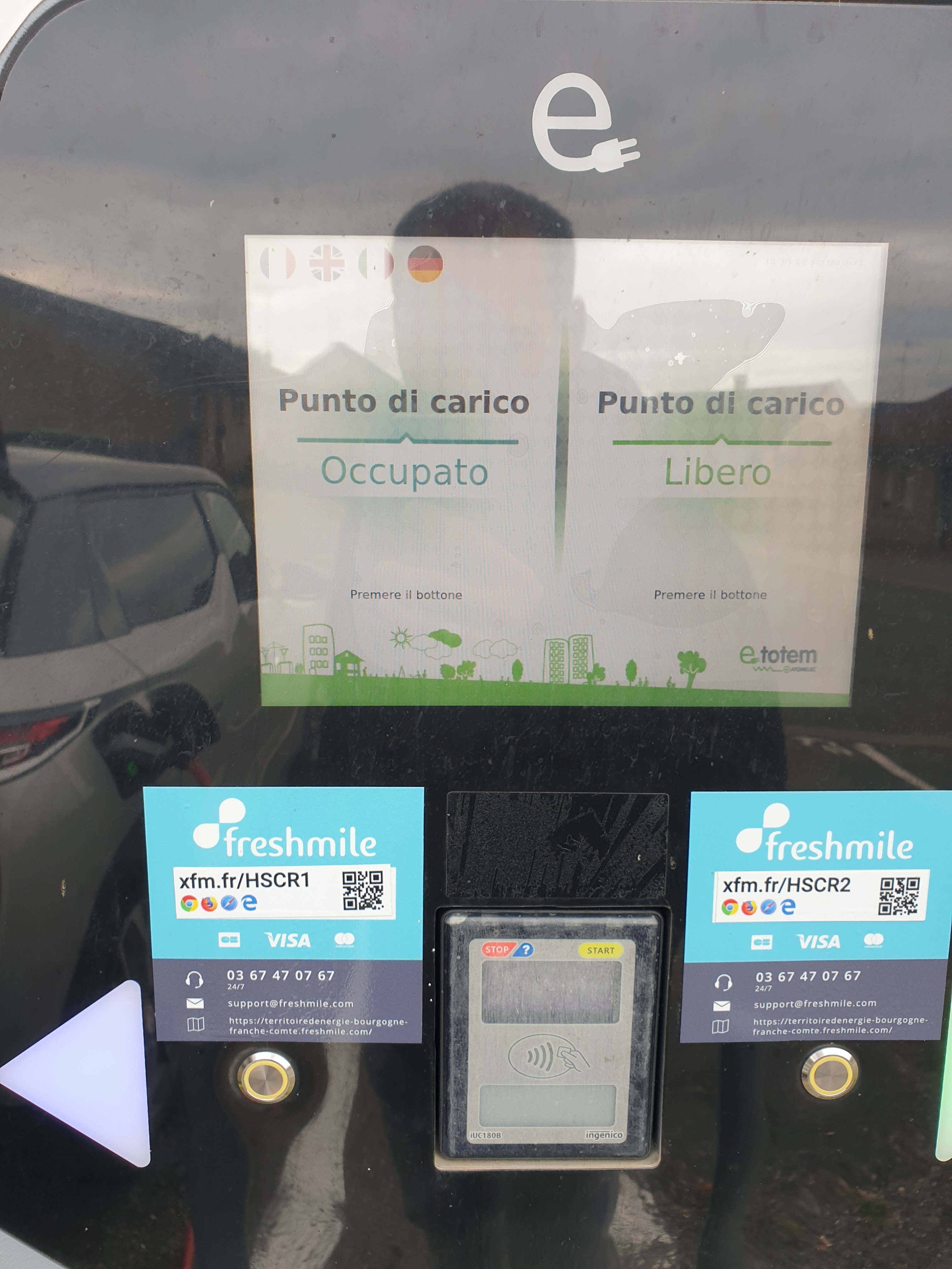 Borne de recharge pour 2 voitures. Très facile d'utilisation. Il suffit de scanner le QR code. Chargement en 22kw très rapide.